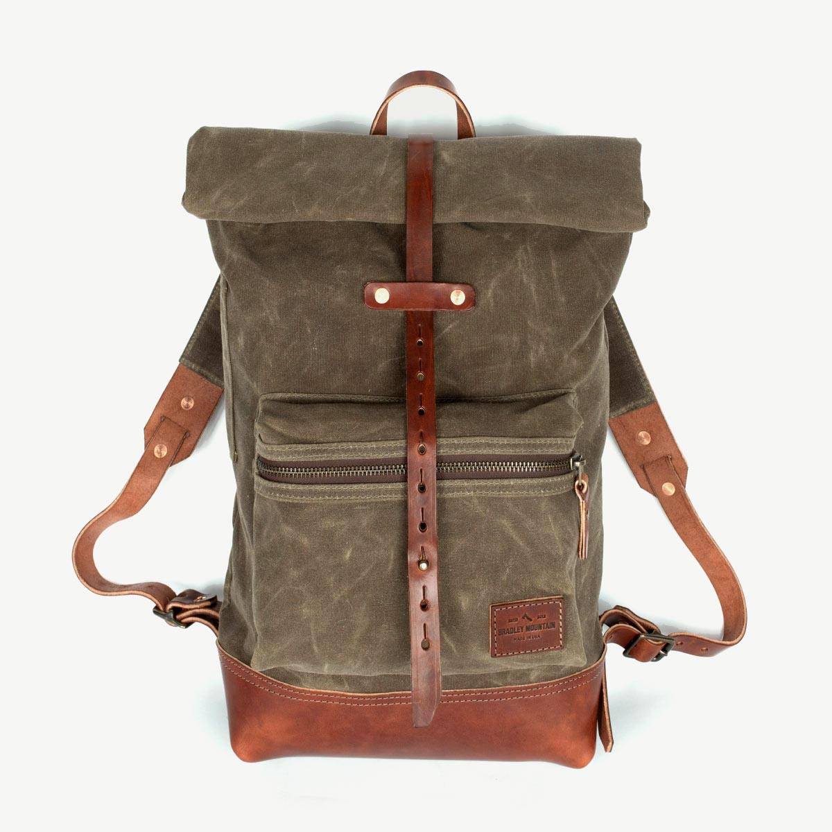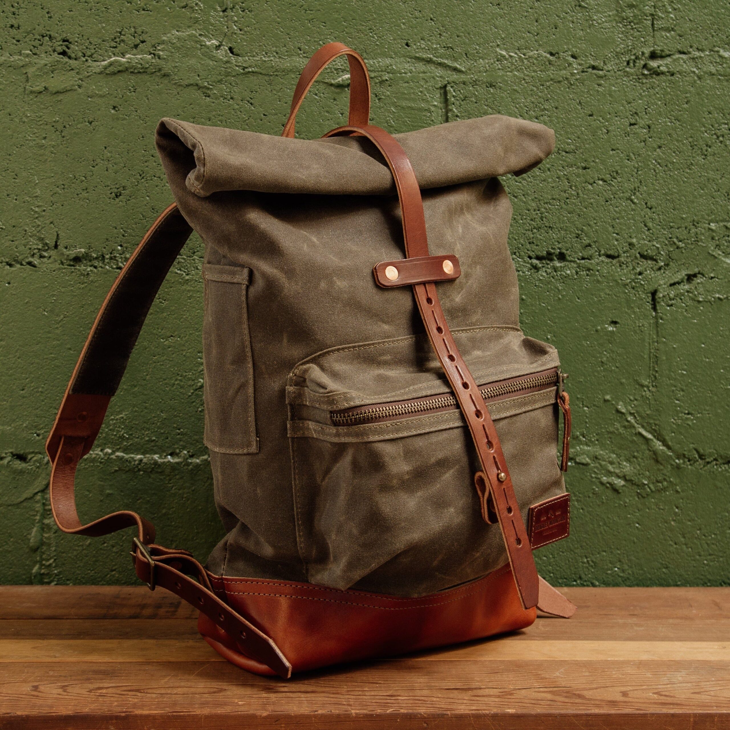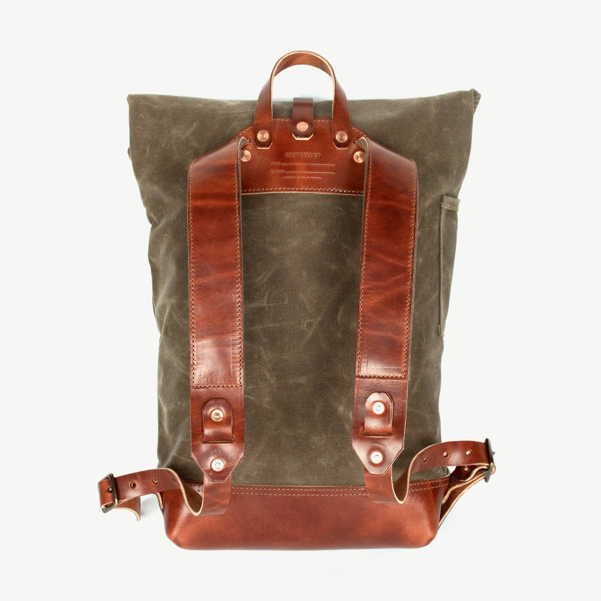 This is a roll top waxed canvas rucksack thoughtfully designed for both the urban and rural adventurer. The straps are all leather & padded with a layer of wool and canvas for comfort. It has a baseline buckle connection which allows for more range in adjustability. The double layer of waxed canvas and the roll top closure work together to protect the contents inside from harsh weather. 18 oz waxed duck canvas 9 oz USA harness leather Antiqued brass zipper Solid brass and copper hardware Roll top closure Wool padded straps Width: 13″ at the mouth of the bag tapering down to 10.5″ at the leather bottom. Height: 22.5″ when open, 17.5″ when closed Depth: 4.5″ Front Pocket: 9″ x 6.5″ x 2″ Side Pocket: 3″ x 5.5″ (perfect for pens) Inside Pocket: 10″ x 12″ fits up to a 16″ laptop 15-20L Volume USA Made