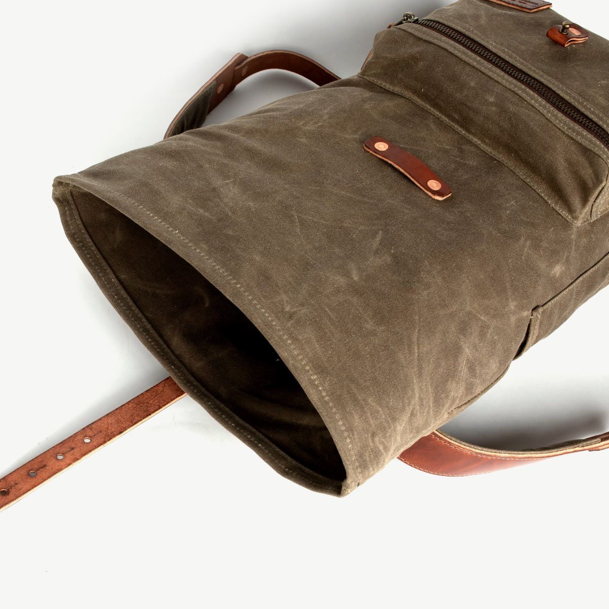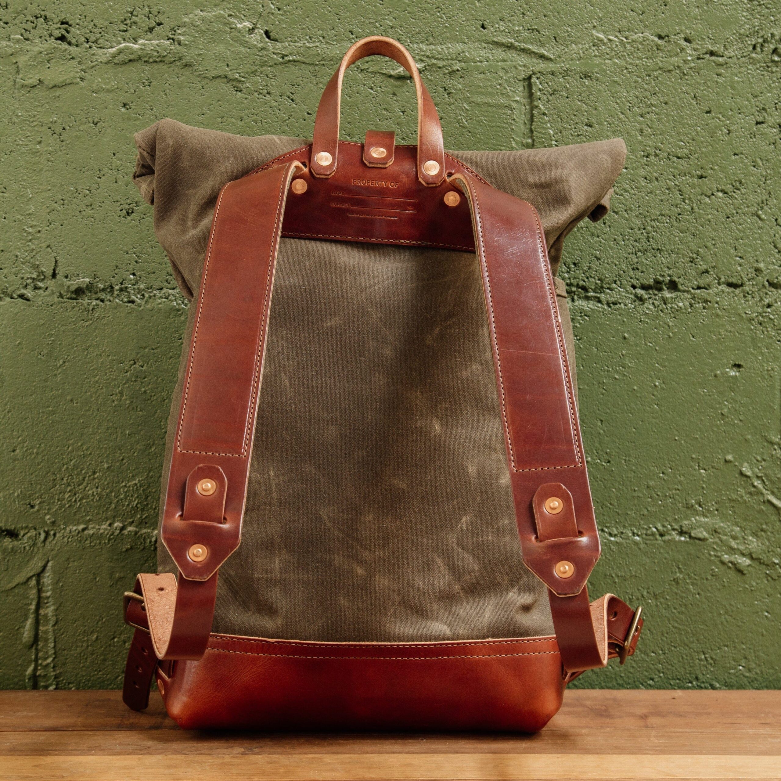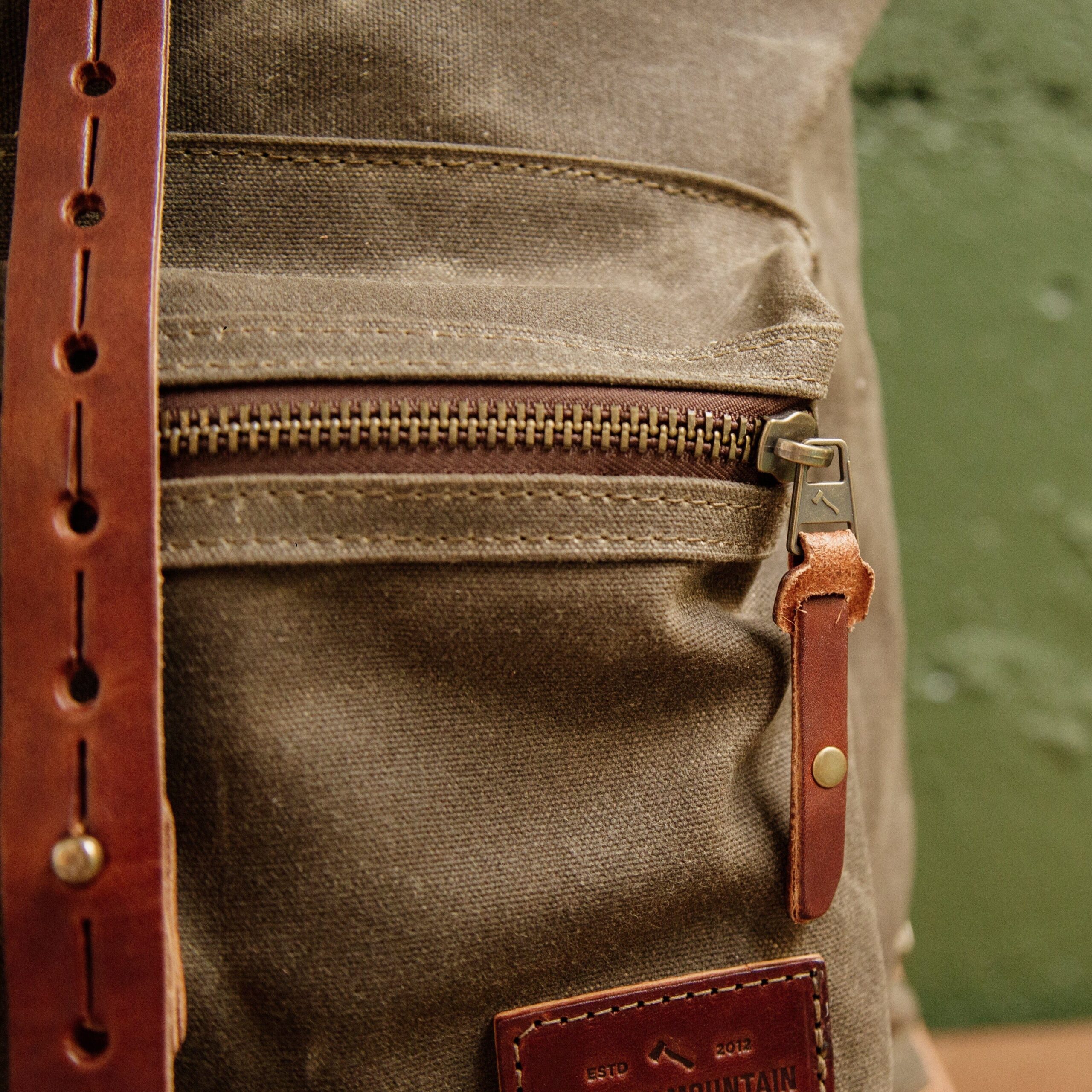 This is a roll top waxed canvas rucksack thoughtfully designed for both the urban and rural adventurer. The straps are all leather & padded with a layer of wool and canvas for comfort. It has a baseline buckle connection which allows for more range in adjustability. The double layer of waxed canvas and the roll top closure work together to protect the contents inside from harsh weather. 18 oz waxed duck canvas 9 oz USA harness leather Antiqued brass zipper Solid brass and copper hardware Roll top closure Wool padded straps Width: 13″ at the mouth of the bag tapering down to 10.5″ at the leather bottom. Height: 22.5″ when open, 17.5″ when closed Depth: 4.5″ Front Pocket: 9″ x 6.5″ x 2″ Side Pocket: 3″ x 5.5″ (perfect for pens) Inside Pocket: 10″ x 12″ fits up to a 16″ laptop 15-20L Volume USA Made